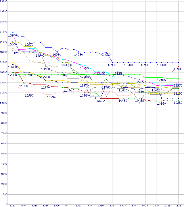 | HDD主要製品(最安値1万円~1万5千円未満)の最安値推移 | | | (2007年3月22日~2007年11月1日) |