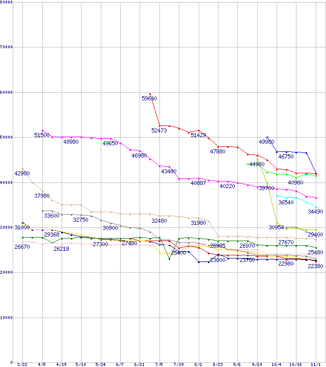 | HDD主要製品(最安値2万円以上)の最安値推移 | | | (2007年3月22日~2007年11月1日) |