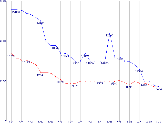 メモリ主要製品の最安値推移