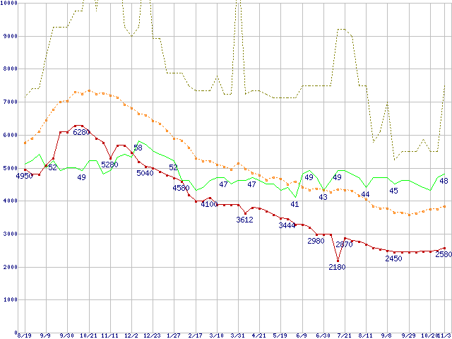 ※このグラフは過去のデータも税率5%相当に調整した税込み相当額のグラフです。 税率変更や、総額表示方式導入(2004年4月)の影響は除いています。 | | | ●凡例 | 最安値 (点線部は販売店未確認 または未調査) | 平均値 | 最高値 | ショップ数 |