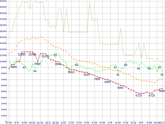 ※このグラフは過去のデータも税率5%相当に調整した税込み相当額のグラフです。 税率変更や、総額表示方式導入(2004年4月)の影響は除いています。 | | | ●凡例 | 最安値 (点線部は販売店未確認 または未調査) | 平均値 | 最高値 | ショップ数 |