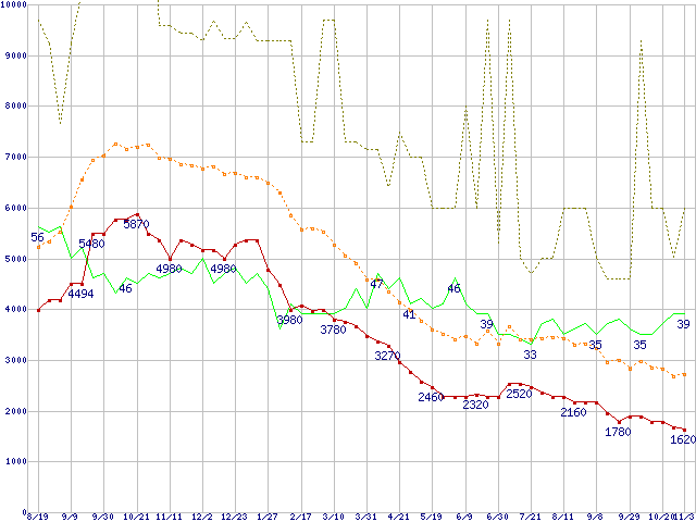 ※このグラフは過去のデータも税率5%相当に調整した税込み相当額のグラフです。 税率変更や、総額表示方式導入(2004年4月)の影響は除いています。 | | | ●凡例 | 最安値 (点線部は販売店未確認 または未調査) | 平均値 | 最高値 | ショップ数 |