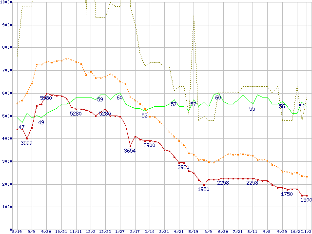 ※このグラフは過去のデータも税率5%相当に調整した税込み相当額のグラフです。 税率変更や、総額表示方式導入(2004年4月)の影響は除いています。 | | | ●凡例 | 最安値 (点線部は販売店未確認 または未調査) | 平均値 | 最高値 | ショップ数 |