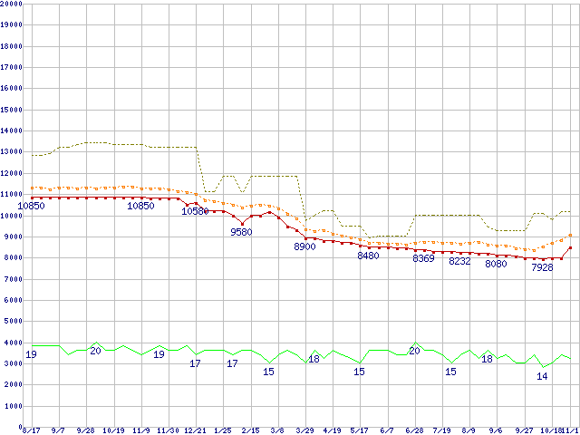 ※このグラフは過去のデータも税率5%相当に調整した税込み相当額のグラフです。 税率変更や、総額表示方式導入(2004年4月)の影響は除いています。 | | | ●凡例 | 最安値 (点線部は販売店未確認 または未調査) | 平均値 | 最高値 | ショップ数 |