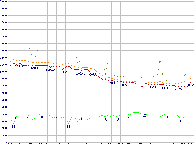 ※このグラフは過去のデータも税率5%相当に調整した税込み相当額のグラフです。 税率変更や、総額表示方式導入(2004年4月)の影響は除いています。 | | | ●凡例 | 最安値 (点線部は販売店未確認 または未調査) | 平均値 | 最高値 | ショップ数 |