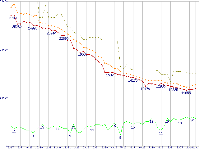 ※このグラフは過去のデータも税率5%相当に調整した税込み相当額のグラフです。 税率変更や、総額表示方式導入(2004年4月)の影響は除いています。 | | | ●凡例 | 最安値 (点線部は販売店未確認 または未調査) | 平均値 | 最高値 | ショップ数 |
