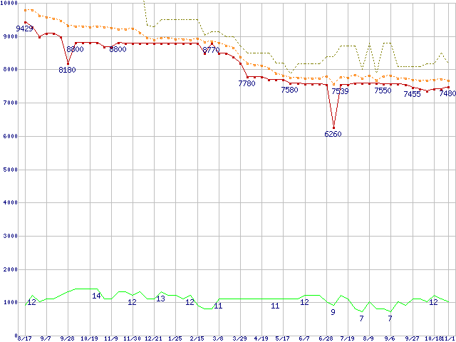 ※このグラフは過去のデータも税率5%相当に調整した税込み相当額のグラフです。 税率変更や、総額表示方式導入(2004年4月)の影響は除いています。 | | | ●凡例 | 最安値 (点線部は販売店未確認 または未調査) | 平均値 | 最高値 | ショップ数 |
