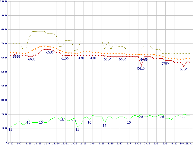 ※このグラフは過去のデータも税率5%相当に調整した税込み相当額のグラフです。 税率変更や、総額表示方式導入(2004年4月)の影響は除いています。 | | | ●凡例 | 最安値 (点線部は販売店未確認 または未調査) | 平均値 | 最高値 | ショップ数 |