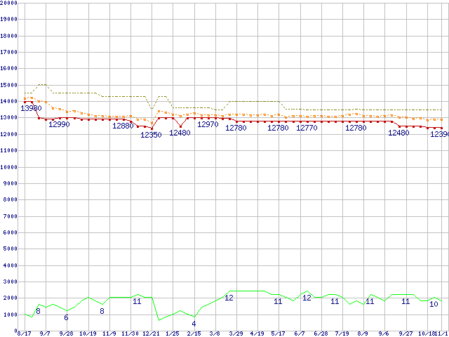 ※このグラフは過去のデータも税率5%相当に調整した税込み相当額のグラフです。 税率変更や、総額表示方式導入(2004年4月)の影響は除いています。 | | | ●凡例 | 最安値 (点線部は販売店未確認 または未調査) | 平均値 | 最高値 | ショップ数 |