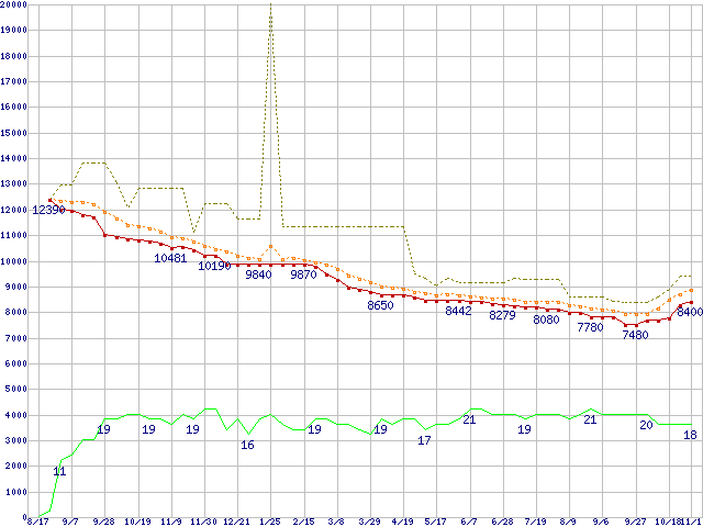 ※このグラフは過去のデータも税率5%相当に調整した税込み相当額のグラフです。 税率変更や、総額表示方式導入(2004年4月)の影響は除いています。 | | | ●凡例 | 最安値 (点線部は販売店未確認 または未調査) | 平均値 | 最高値 | ショップ数 |