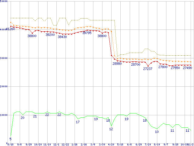 ※このグラフは過去のデータも税率5%相当に調整した税込み相当額のグラフです。 税率変更や、総額表示方式導入(2004年4月)の影響は除いています。 | | | ●凡例 | 最安値 (点線部は販売店未確認 または未調査) | 平均値 | 最高値 | ショップ数 |