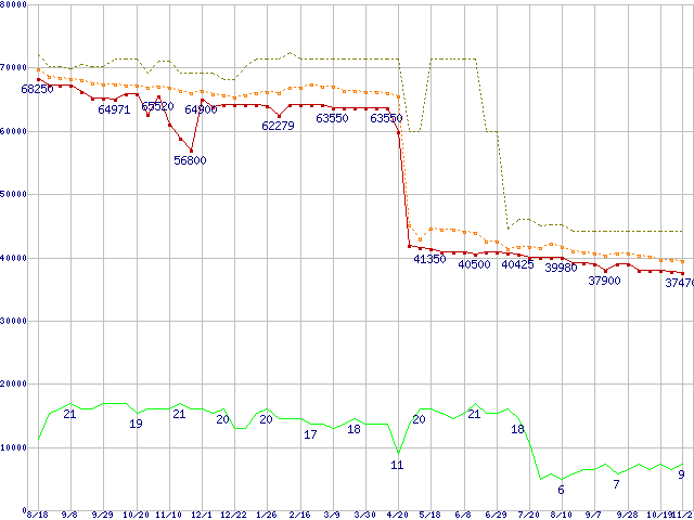| Core 2 Duo E6700 (2.66GHz,L2 4MB)の価格推移 | | | (2006年8月18日~2007年11月2日) |