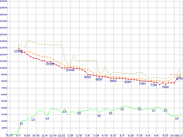 ※このグラフは過去のデータも税率5%相当に調整した税込み相当額のグラフです。 税率変更や、総額表示方式導入(2004年4月)の影響は除いています。 | | | ●凡例 | 最安値 (点線部は販売店未確認 または未調査) | 平均値 | 最高値 | ショップ数 |