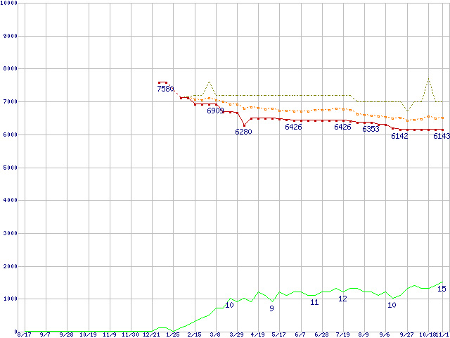 ※このグラフは過去のデータも税率5%相当に調整した税込み相当額のグラフです。 税率変更や、総額表示方式導入(2004年4月)の影響は除いています。 | | | ●凡例 | 最安値 (点線部は販売店未確認 または未調査) | 平均値 | 最高値 | ショップ数 |