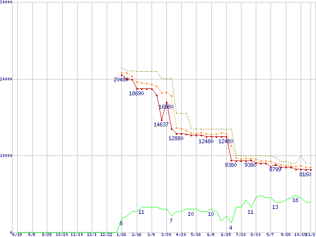 ※このグラフは過去のデータも税率5%相当に調整した税込み相当額のグラフです。 税率変更や、総額表示方式導入(2004年4月)の影響は除いています。 | | | ●凡例 | 最安値 (点線部は販売店未確認 または未調査) | 平均値 | 最高値 | ショップ数 |