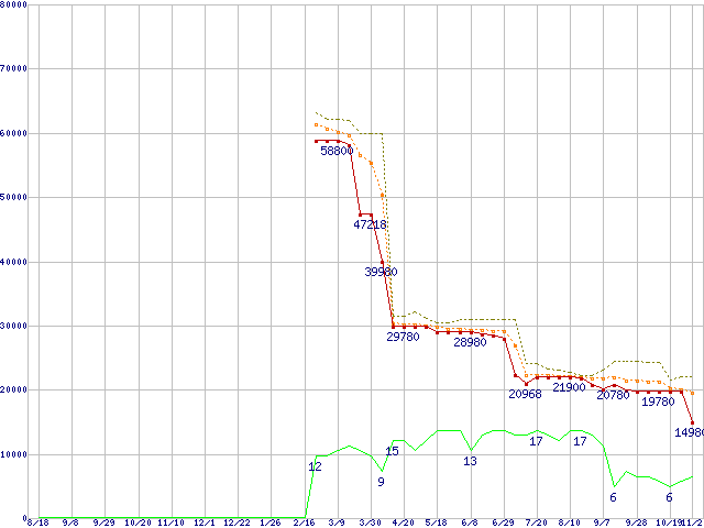 ※このグラフは過去のデータも税率5%相当に調整した税込み相当額のグラフです。 税率変更や、総額表示方式導入(2004年4月)の影響は除いています。 | | | ●凡例 | 最安値 (点線部は販売店未確認 または未調査) | 平均値 | 最高値 | ショップ数 |