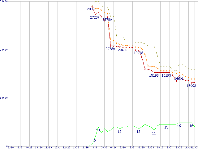 | Athlon 64 X2 5000+ (2.6GHz,L2 512KB×2,TDP65W)の価格推移 | | | (2006年8月18日~2007年11月2日) |