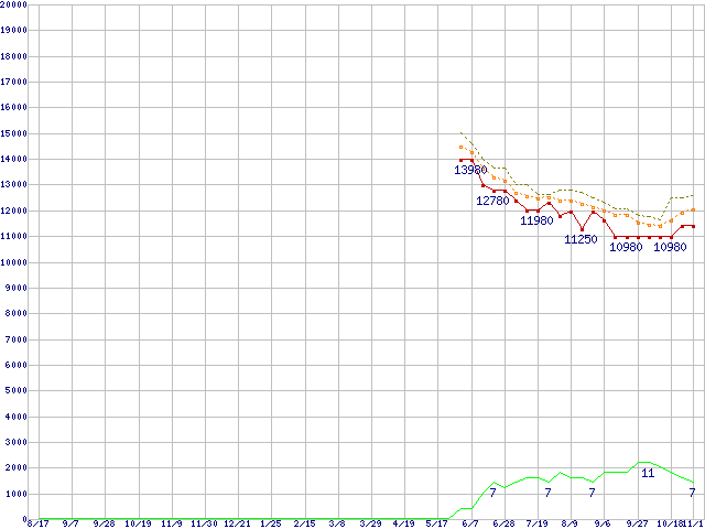 ※このグラフは過去のデータも税率5%相当に調整した税込み相当額のグラフです。 税率変更や、総額表示方式導入(2004年4月)の影響は除いています。 | | | ●凡例 | 最安値 (点線部は販売店未確認 または未調査) | 平均値 | 最高値 | ショップ数 |