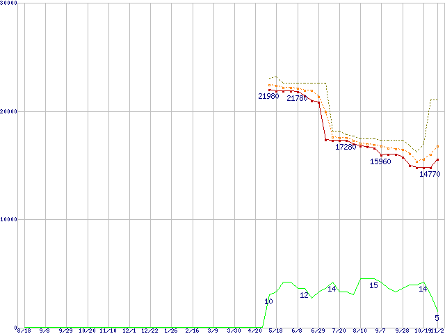 ※このグラフは過去のデータも税率5%相当に調整した税込み相当額のグラフです。 税率変更や、総額表示方式導入(2004年4月)の影響は除いています。 | | | ●凡例 | 最安値 (点線部は販売店未確認 または未調査) | 平均値 | 最高値 | ショップ数 |