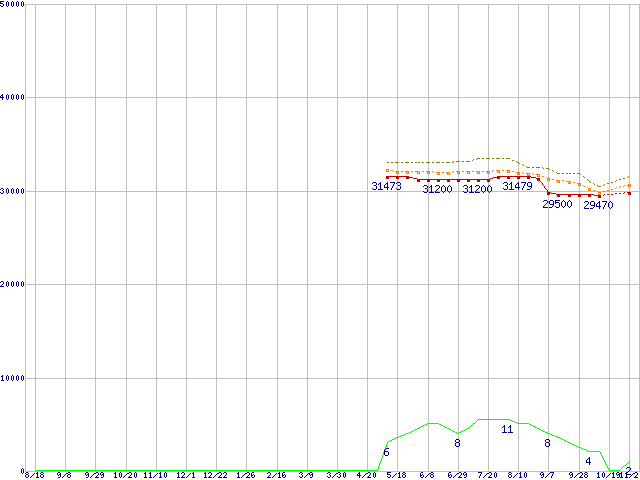 ※このグラフは過去のデータも税率5%相当に調整した税込み相当額のグラフです。 税率変更や、総額表示方式導入(2004年4月)の影響は除いています。 | | | ●凡例 | 最安値 (点線部は販売店未確認 または未調査) | 平均値 | 最高値 | ショップ数 |