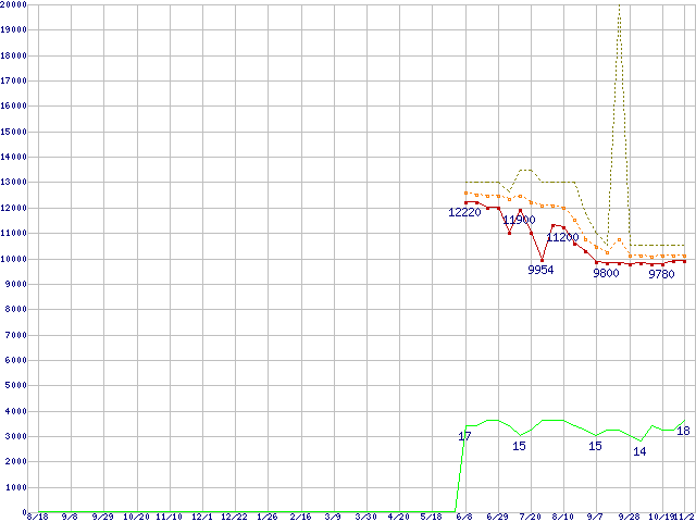 ※このグラフは過去のデータも税率5%相当に調整した税込み相当額のグラフです。 税率変更や、総額表示方式導入(2004年4月)の影響は除いています。 | | | ●凡例 | 最安値 (点線部は販売店未確認 または未調査) | 平均値 | 最高値 | ショップ数 |