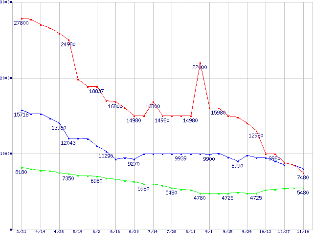 メモリ主要製品(最安値1万円以上)の最安値推移