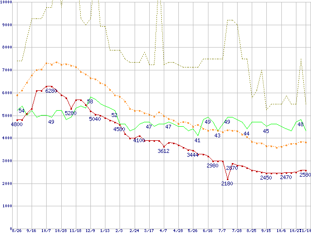 ※このグラフは過去のデータも税率5%相当に調整した税込み相当額のグラフです。 税率変更や、総額表示方式導入(2004年4月)の影響は除いています。 | | | ●凡例 | 最安値 (点線部は販売店未確認 または未調査) | 平均値 | 最高値 | ショップ数 |