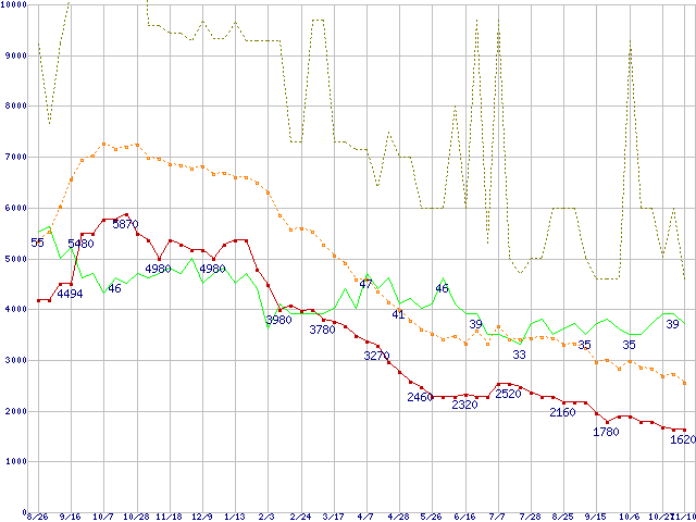 ※このグラフは過去のデータも税率5%相当に調整した税込み相当額のグラフです。 税率変更や、総額表示方式導入(2004年4月)の影響は除いています。 | | | ●凡例 | 最安値 (点線部は販売店未確認 または未調査) | 平均値 | 最高値 | ショップ数 |