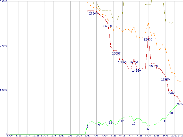 ※このグラフは過去のデータも税率5%相当に調整した税込み相当額のグラフです。 税率変更や、総額表示方式導入(2004年4月)の影響は除いています。 | | | ●凡例 | 最安値 (点線部は販売店未確認 または未調査) | 平均値 | 最高値 | ショップ数 |