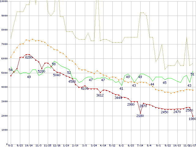 ※このグラフは過去のデータも税率5%相当に調整した税込み相当額のグラフです。 税率変更や、総額表示方式導入(2004年4月)の影響は除いています。 | | | ●凡例 | 最安値 (点線部は販売店未確認 または未調査) | 平均値 | 最高値 | ショップ数 |
