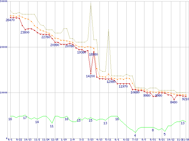 ※このグラフは過去のデータも税率5%相当に調整した税込み相当額のグラフです。 税率変更や、総額表示方式導入(2004年4月)の影響は除いています。 | | | ●凡例 | 最安値 (点線部は販売店未確認 または未調査) | 平均値 | 最高値 | ショップ数 |