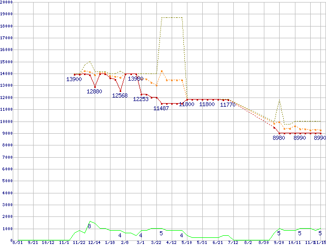 ※このグラフは過去のデータも税率5%相当に調整した税込み相当額のグラフです。 税率変更や、総額表示方式導入(2004年4月)の影響は除いています。 | | | ●凡例 | 最安値 (点線部は販売店未確認 または未調査) | 平均値 | 最高値 | ショップ数 |