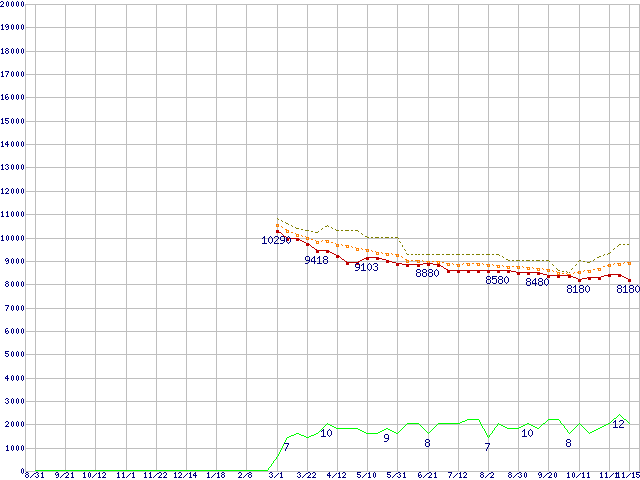 ※このグラフは過去のデータも税率5%相当に調整した税込み相当額のグラフです。 税率変更や、総額表示方式導入(2004年4月)の影響は除いています。 | | | ●凡例 | 最安値 (点線部は販売店未確認 または未調査) | 平均値 | 最高値 | ショップ数 |
