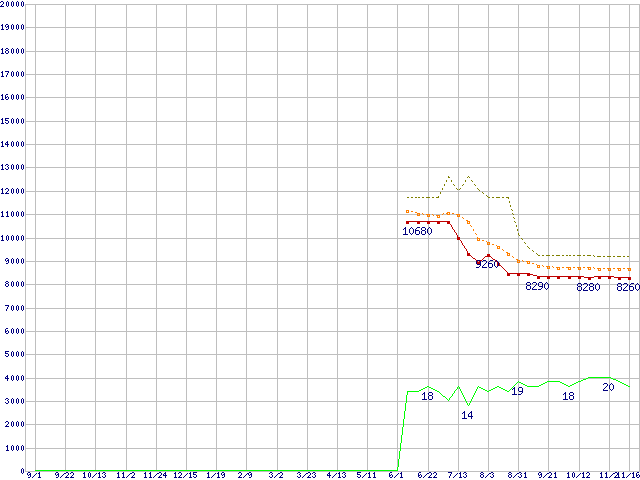 ※このグラフは過去のデータも税率5%相当に調整した税込み相当額のグラフです。 税率変更や、総額表示方式導入(2004年4月)の影響は除いています。 | | | ●凡例 | 最安値 (点線部は販売店未確認 または未調査) | 平均値 | 最高値 | ショップ数 |