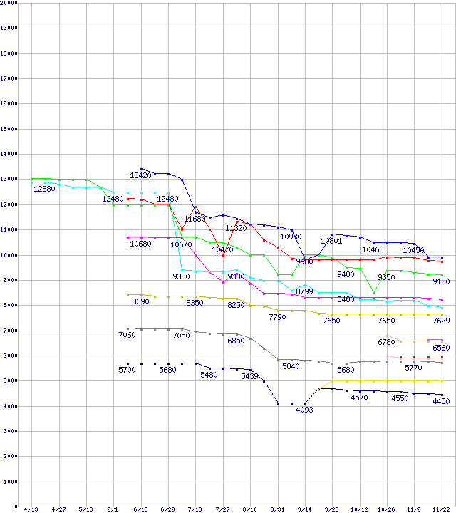 | CPU主要製品(最安値1万円未満)の最安値推移 | | | (2007年4月13日~2007年11月22日) |