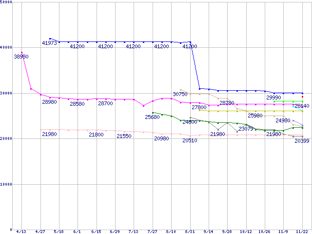 | CPU主要製品(最安値2万円~3万円未満)の最安値推移 | | | (2007年4月13日~2007年11月22日) |