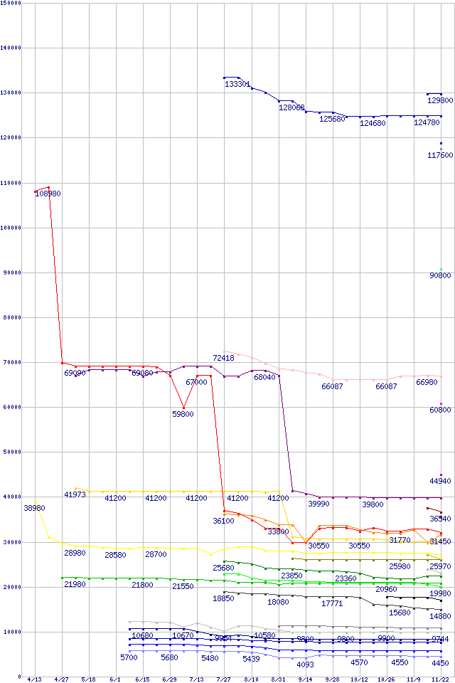 ※製品名をクリックすると個別のグラフを表示します ※点線部は販売店が確認できなかった、または調査データがないことを示します |