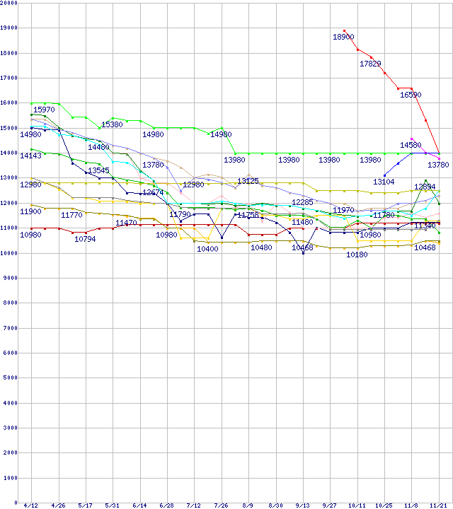 | HDD主要製品(最安値1万円~1万5千円未満)の最安値推移 | | | (2007年4月12日~2007年11月21日) |