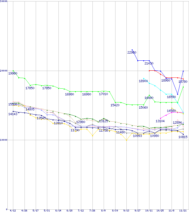 | HDD 500~750GB未満の最安値推移 | | | (2007年4月12日~2007年11月21日) |