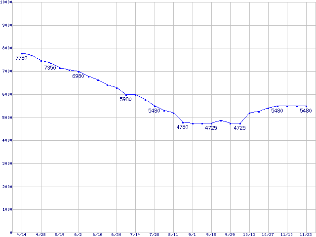 | メモリ主要製品(最安値5千円~1万円未満)の最安値推移 | | | (2007年4月14日~2007年11月23日) |