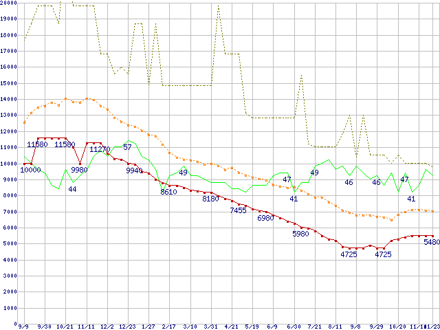 ※このグラフは過去のデータも税率5%相当に調整した税込み相当額のグラフです。 税率変更や、総額表示方式導入(2004年4月)の影響は除いています。 | | | ●凡例 | 最安値 (点線部は販売店未確認 または未調査) | 平均値 | 最高値 | ショップ数 |