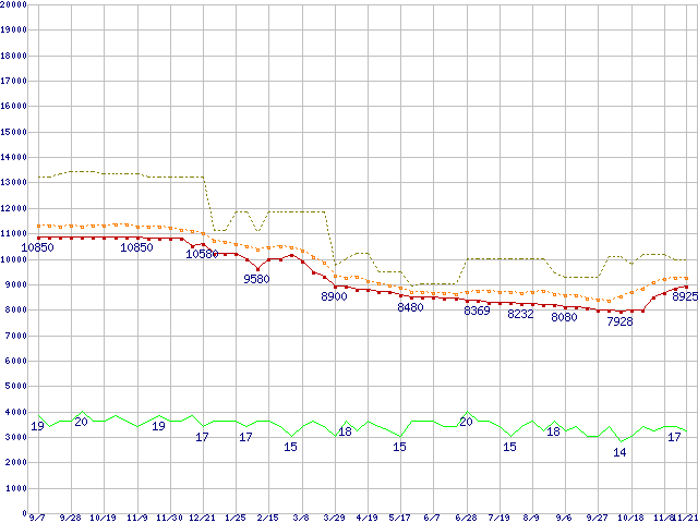 ※このグラフは過去のデータも税率5%相当に調整した税込み相当額のグラフです。 税率変更や、総額表示方式導入(2004年4月)の影響は除いています。 | | | ●凡例 | 最安値 (点線部は販売店未確認 または未調査) | 平均値 | 最高値 | ショップ数 |