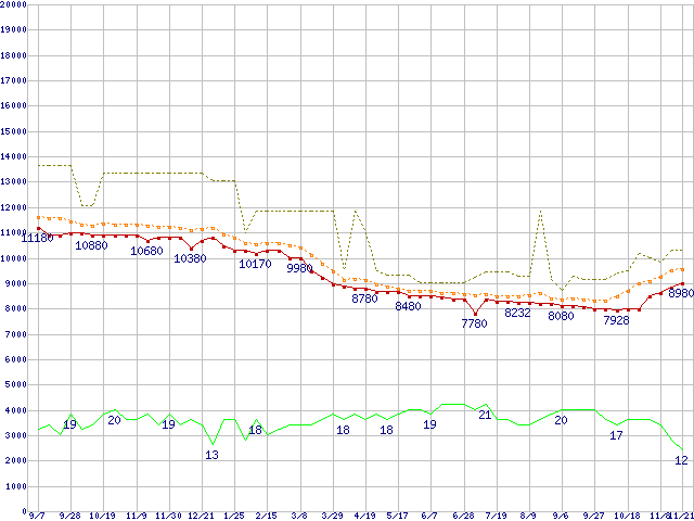 ※このグラフは過去のデータも税率5%相当に調整した税込み相当額のグラフです。 税率変更や、総額表示方式導入(2004年4月)の影響は除いています。 | | | ●凡例 | 最安値 (点線部は販売店未確認 または未調査) | 平均値 | 最高値 | ショップ数 |