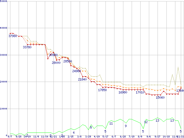 ※このグラフは過去のデータも税率5%相当に調整した税込み相当額のグラフです。 税率変更や、総額表示方式導入(2004年4月)の影響は除いています。 | | | ●凡例 | 最安値 (点線部は販売店未確認 または未調査) | 平均値 | 最高値 | ショップ数 |