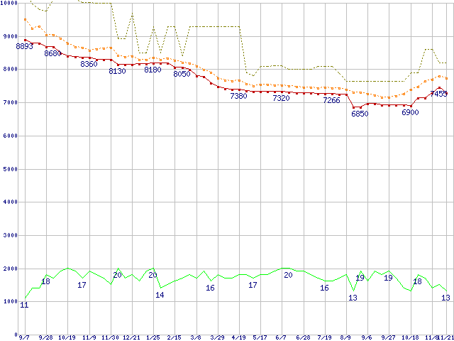 ※このグラフは過去のデータも税率5%相当に調整した税込み相当額のグラフです。 税率変更や、総額表示方式導入(2004年4月)の影響は除いています。 | | | ●凡例 | 最安値 (点線部は販売店未確認 または未調査) | 平均値 | 最高値 | ショップ数 |