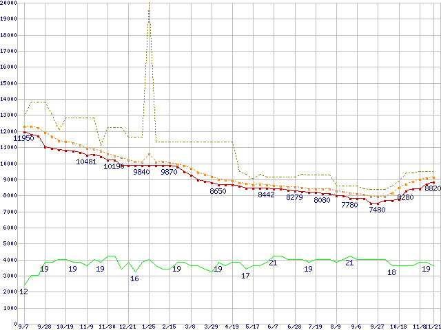 ※このグラフは過去のデータも税率5%相当に調整した税込み相当額のグラフです。 税率変更や、総額表示方式導入(2004年4月)の影響は除いています。 | | | ●凡例 | 最安値 (点線部は販売店未確認 または未調査) | 平均値 | 最高値 | ショップ数 |