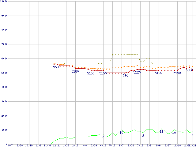 ※このグラフは過去のデータも税率5%相当に調整した税込み相当額のグラフです。 税率変更や、総額表示方式導入(2004年4月)の影響は除いています。 | | | ●凡例 | 最安値 (点線部は販売店未確認 または未調査) | 平均値 | 最高値 | ショップ数 |