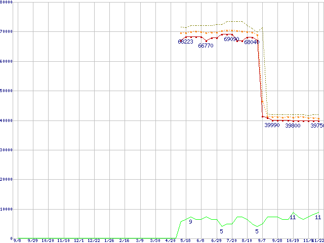 | Core 2 Duo T7700 (2.4GHz,L2 4MB)の価格推移 | | | (2006年9月8日~2007年11月22日) |