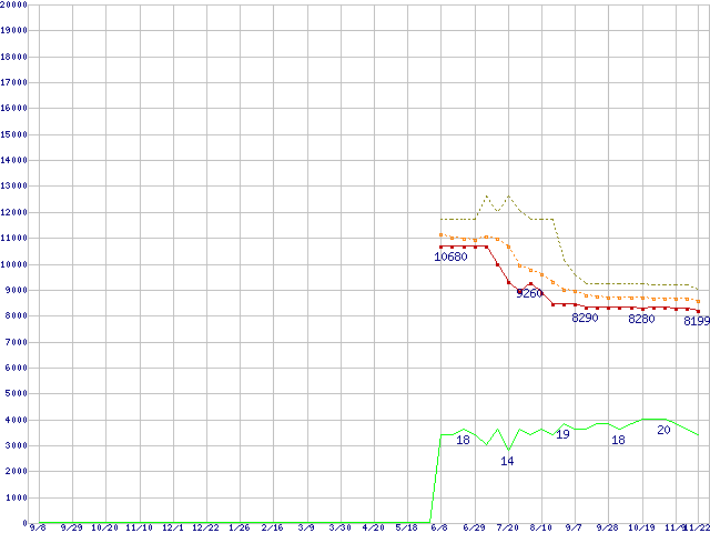 ※このグラフは過去のデータも税率5%相当に調整した税込み相当額のグラフです。 税率変更や、総額表示方式導入(2004年4月)の影響は除いています。 | | | ●凡例 | 最安値 (点線部は販売店未確認 または未調査) | 平均値 | 最高値 | ショップ数 |