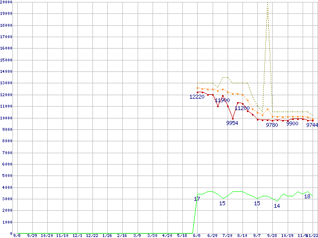 ※このグラフは過去のデータも税率5%相当に調整した税込み相当額のグラフです。 税率変更や、総額表示方式導入(2004年4月)の影響は除いています。 | | | ●凡例 | 最安値 (点線部は販売店未確認 または未調査) | 平均値 | 最高値 | ショップ数 |